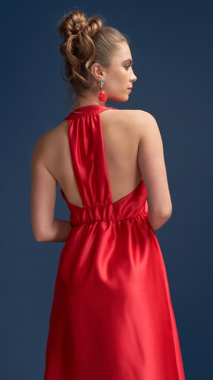 Introducing Odette Observing, a breathtaking halter dress that demands attention with its deep plunge neckline and striking centre back panel. Elevate your style with a captivating red hue that exudes confidence, and let the gathered floor-grazing skirt make every step a statement in sophistication. With mood-boosting shades of red dominating the runways and red carpets, now's the time to embrace this bold hue and secure your traffic-stopping look. Step out with confidence this season and make a fiery comeback that's impossible to ignore.