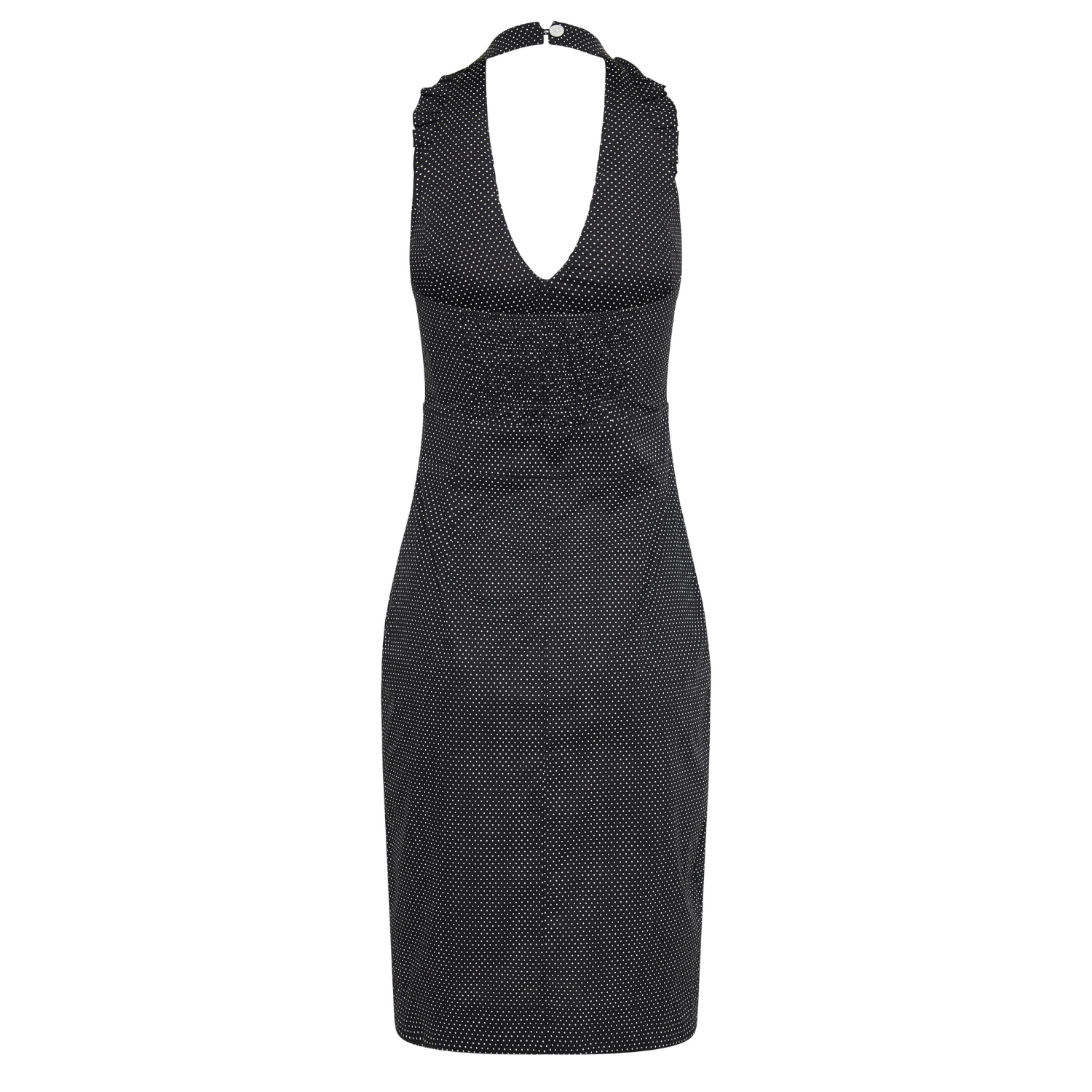 - Neckline: Deep plunge ruffled halter with button closure