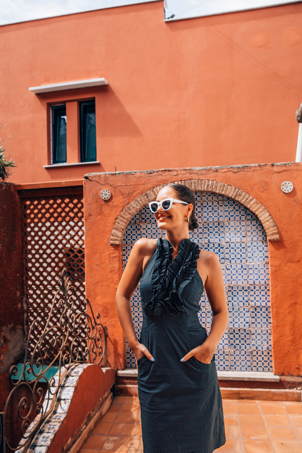 Betsy Beauty Frill Neck Halter Dress in Black Pin Spot