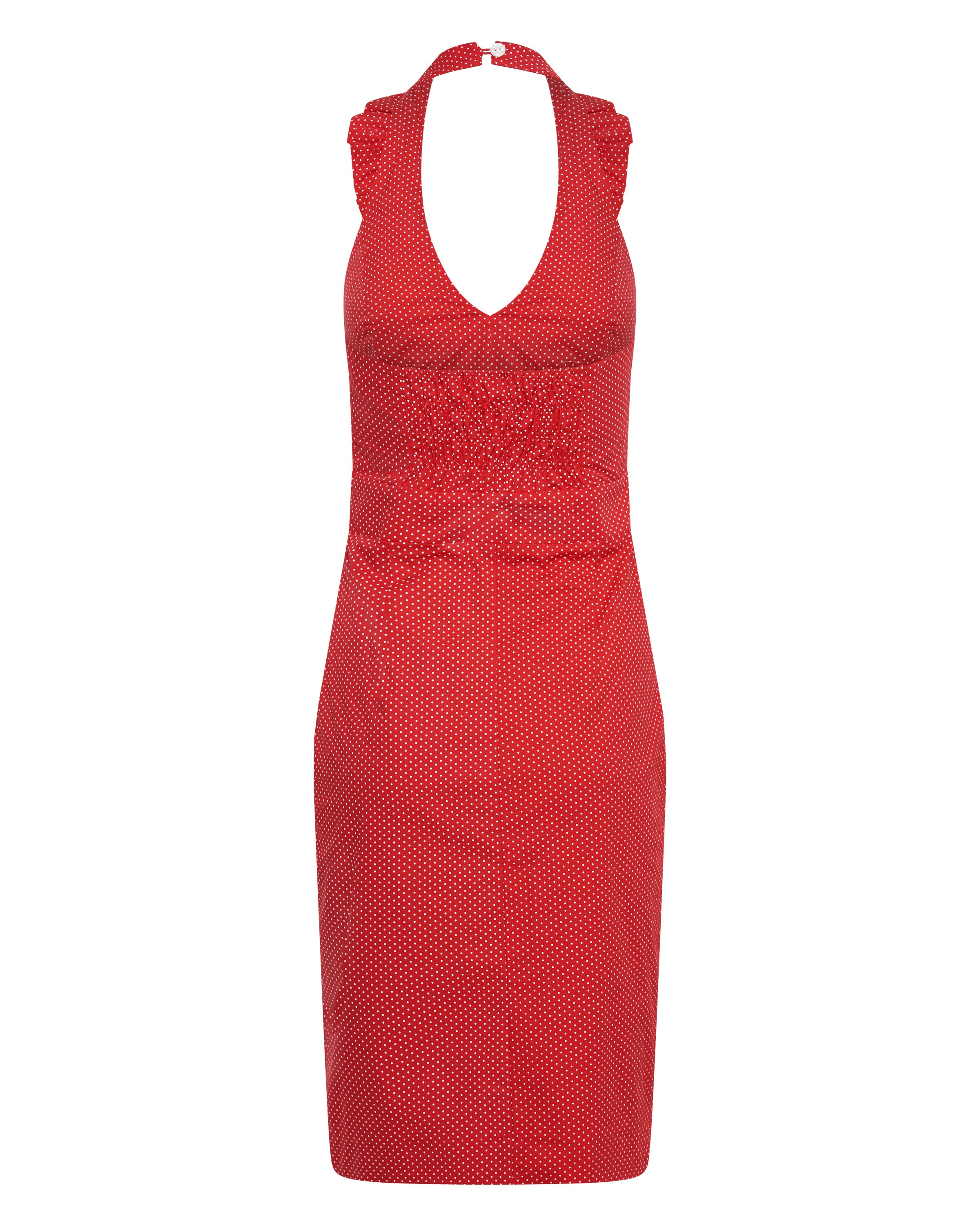 Betsy Beauty Frill Neck Halter Dress in Red Pin Spot