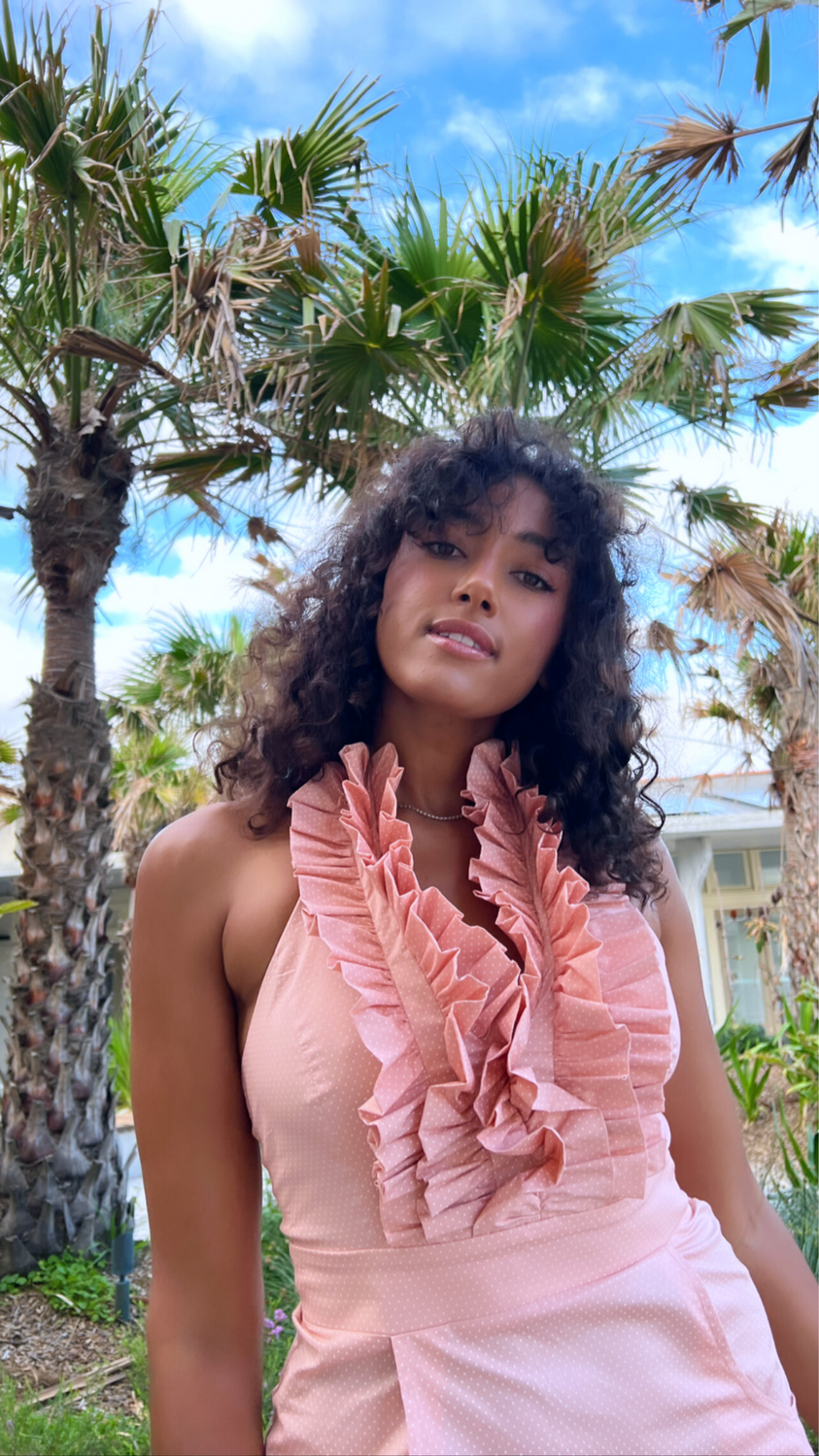 Introducing Betsy Beauty, a stunning halter dress designed to make a statement with its stylish silhouette and playful ruffle details. Crafted with care in Australia, this dress embodies elegance and sophistication with a touch of fun.
