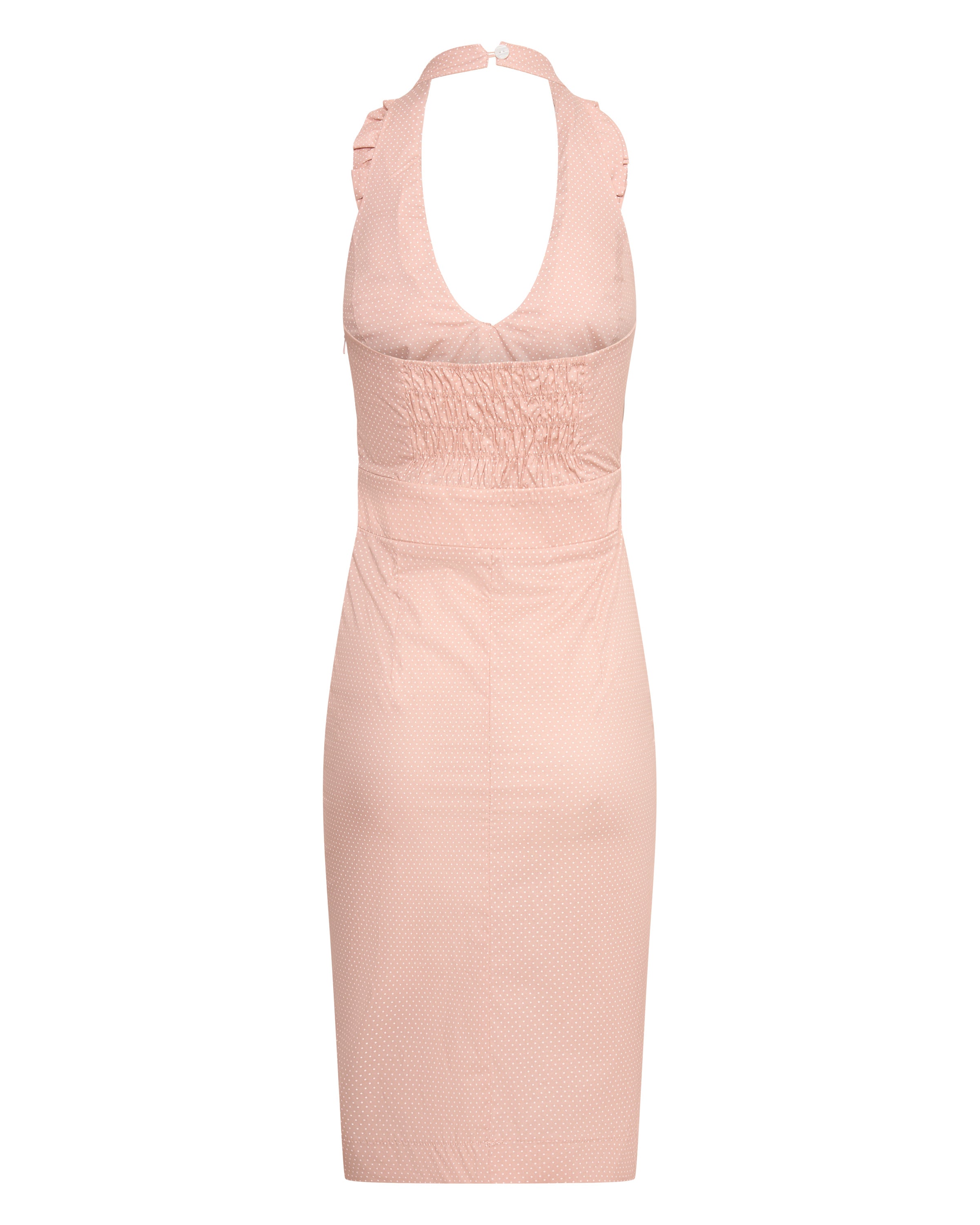 Betsy Beauty Frill Neck Halter Dress in Pink Pin Spot