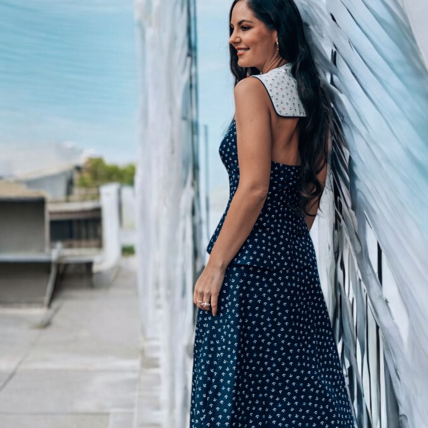 Introducing the captivating Loretta Laughing Anchor Print Midi Dress, where nautical charm meets feminine elegance. This stunning dress features a flattering peplum frill and meticulously hand-sewn statement anchor buttons, adding a touch of maritime flair to your wardrobe. The halter neckline offers a modern twist on the classic sailor collar, beautifully finished with navy piping for a polished look.
