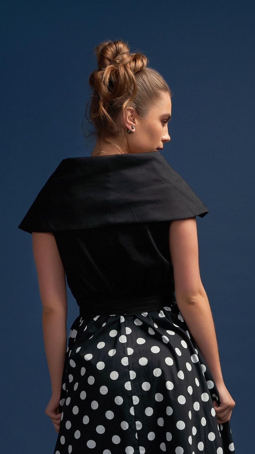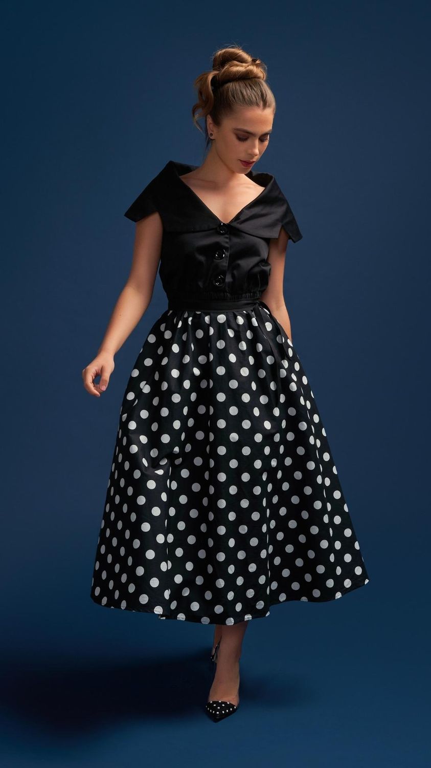 Tatiana Twirling dress with Cape Collar and Full skirt in Black & White Polka Dot