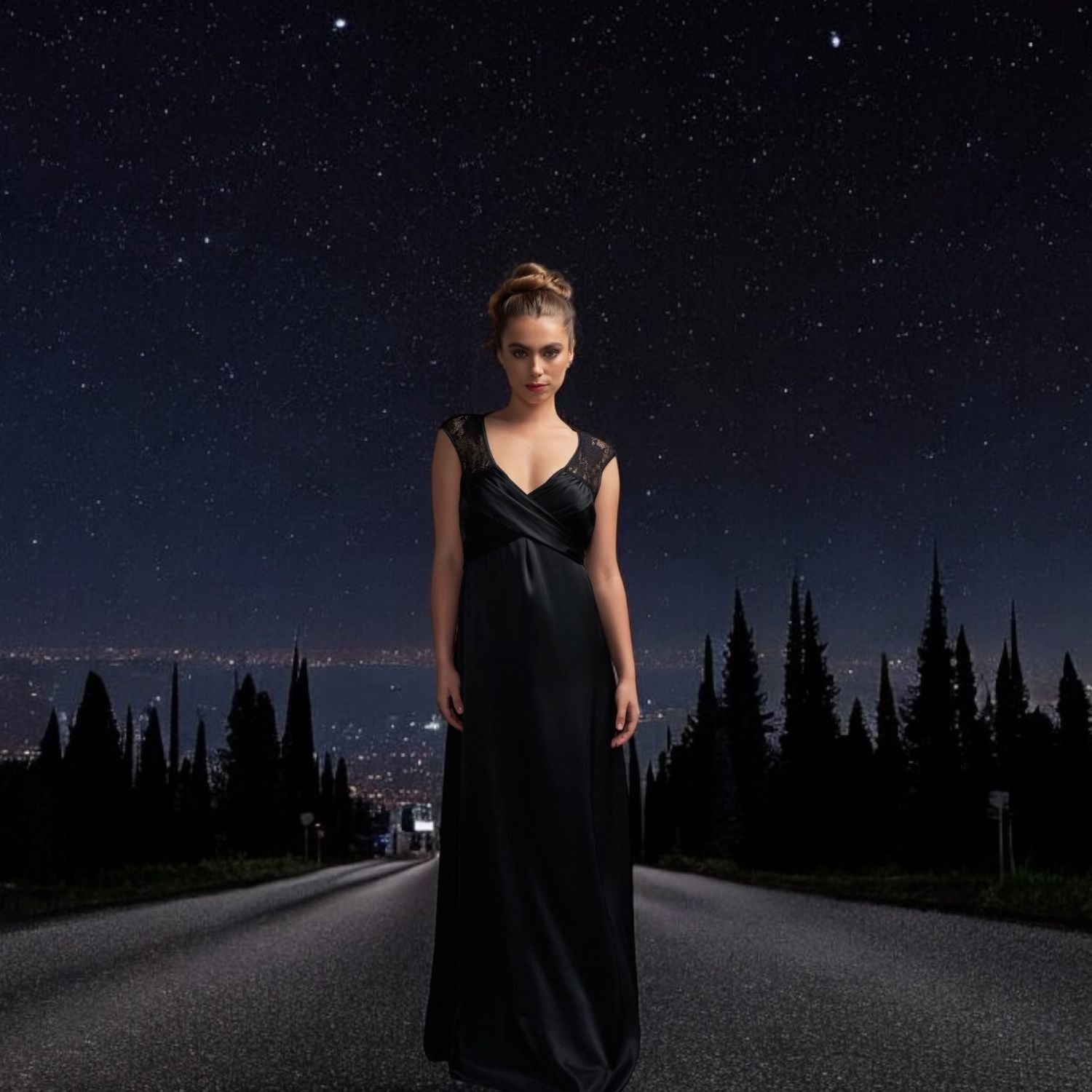 Experience the allure of the Victoria Vacationing full-length gown in timeless black. This sophisticated dress is designed to make a statement with its dramatic lace back and shoulder panels, adorned with feature ties that wrap from the front under the bust to the back for a flawless fit. The feminine sweeping skirt adds a touch of elegance, while delicate lace detailing completes the look for those unforgettable after-dark moments.