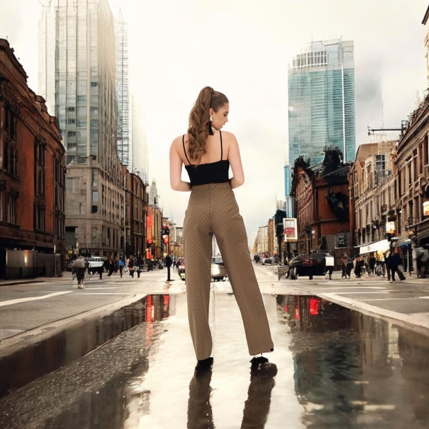Introducing our Ivy Impressing High Waisted Wide Leg Trousers, meticulously crafted from luxurious mosaic jacquard fabric, making them a timeless staple in any wardrobe. These trousers feature an invisible back zipper and boast a flattering fit and flare silhouette for a modern yet classic look.