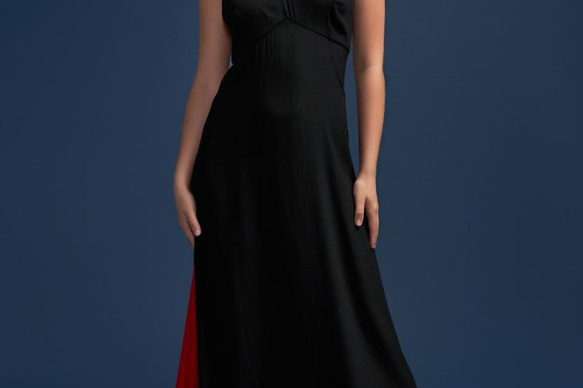 Margaret Mesmerising Floor length gown with red godet panel and crystal zipper