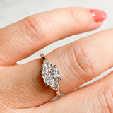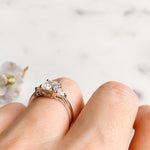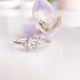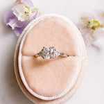 The April ring is a stunning three-stone design with a radiant cut centre stone and trillion side stones. It features a low set basket and delicate claw prongs for a classy and feminine look.