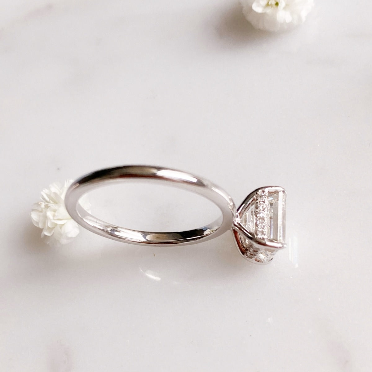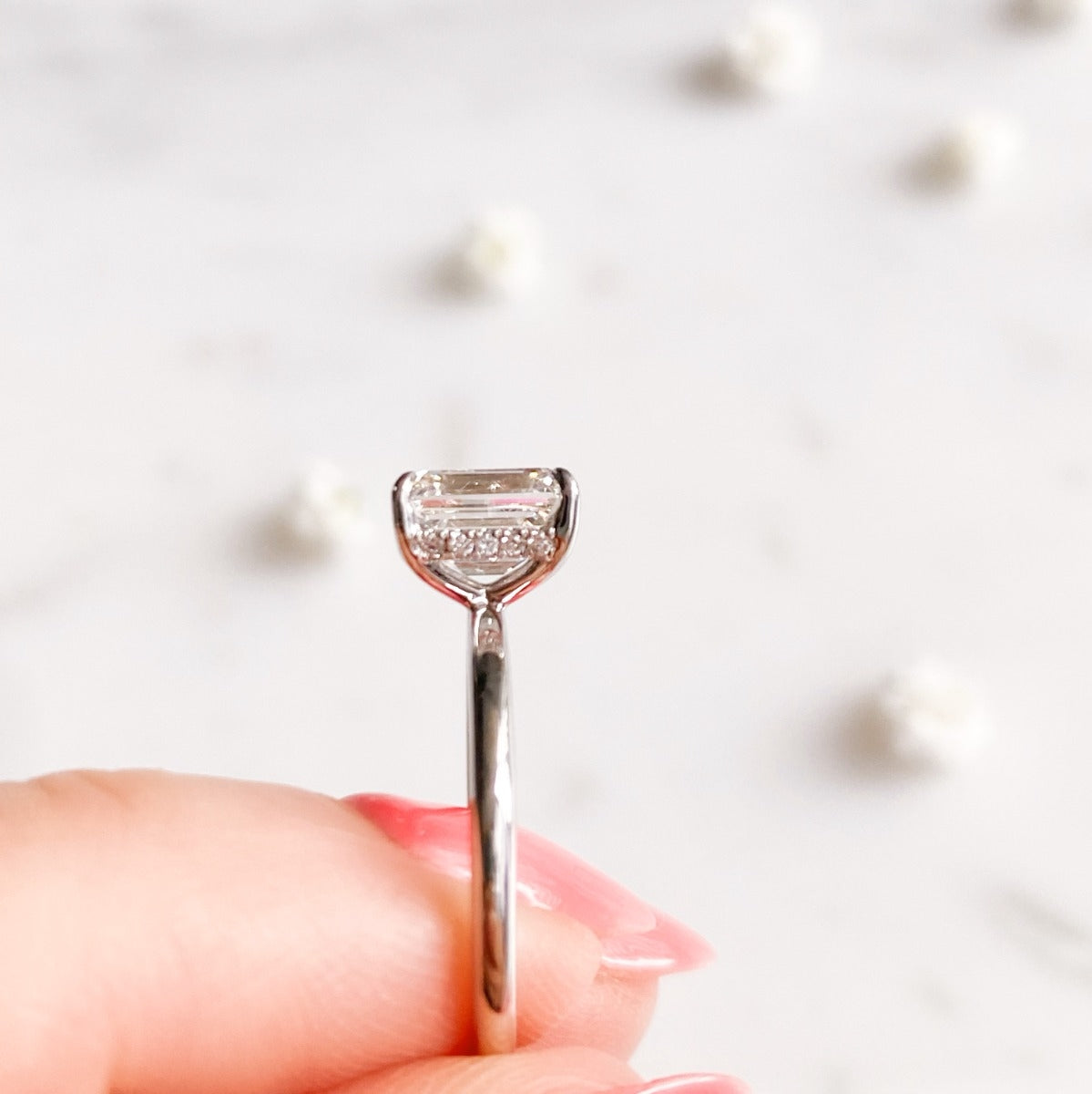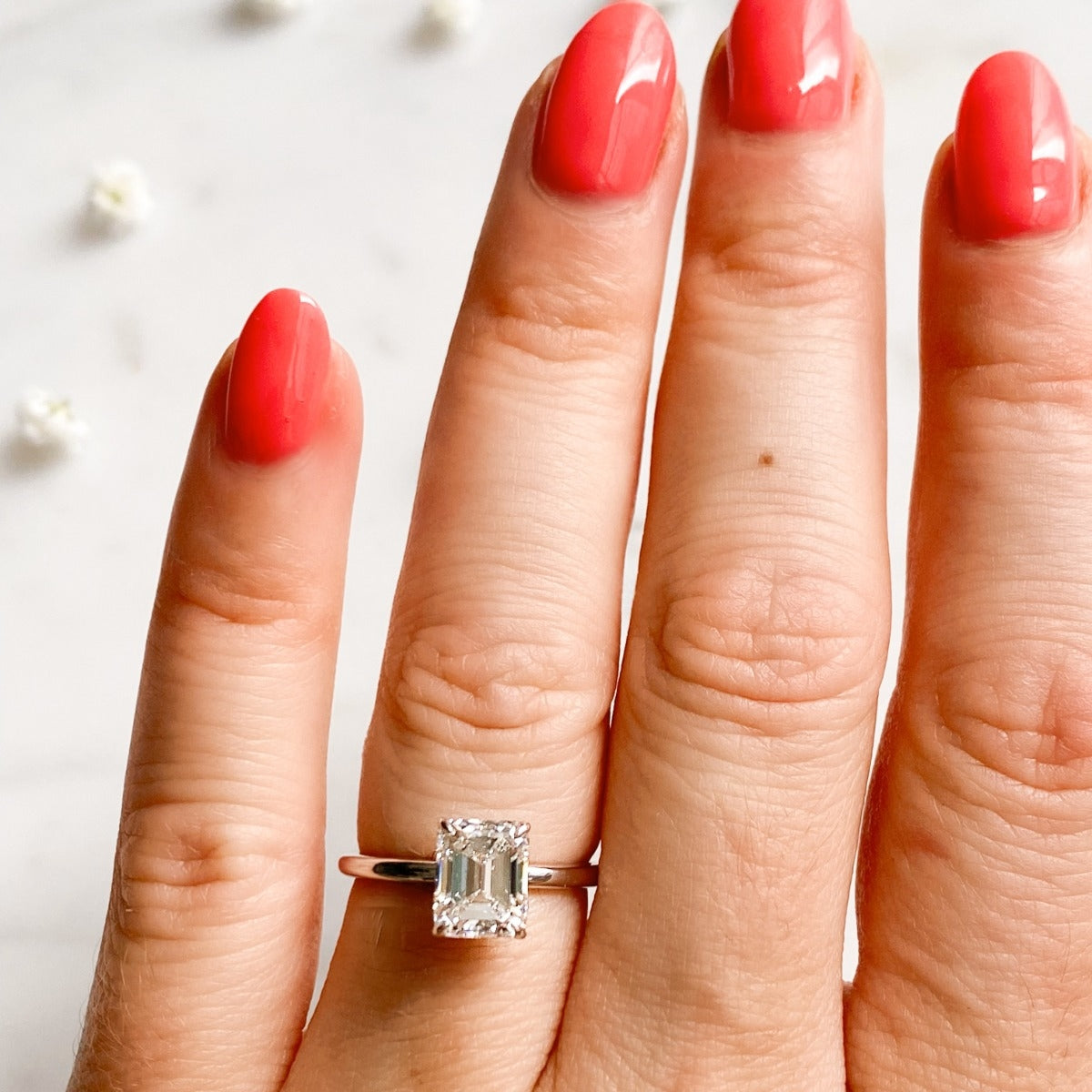 The Grace Solitaire 2.01ct Emerald Cultured Diamond ring features a fine band, a hidden halo and refined claw prong basket. This is a classic and elegant setting, which highlights the beauty of the solitaire stone. Perfect for effortless elegance and timeless appeal.