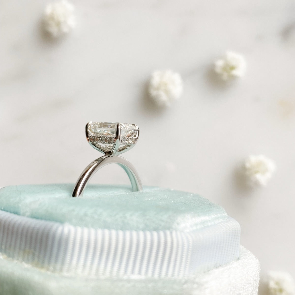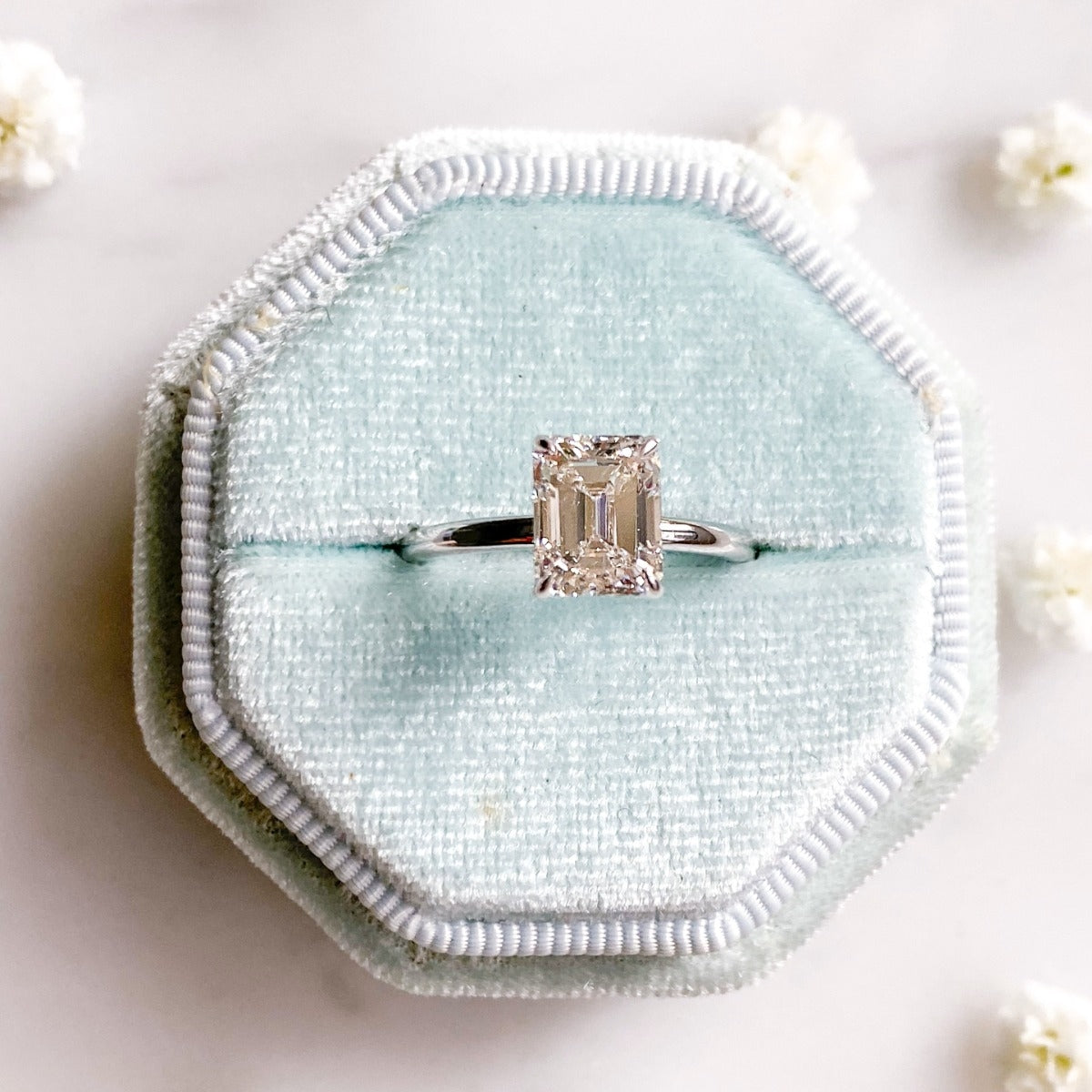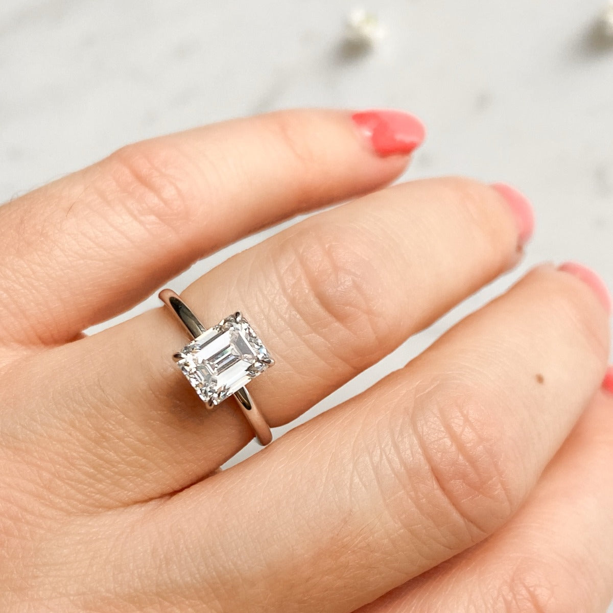 The Grace Solitaire 2.01ct Emerald Cultured Diamond ring features a fine band, a hidden halo and refined claw prong basket. This is a classic and elegant setting, which highlights the beauty of the solitaire stone. Perfect for effortless elegance and timeless appeal.