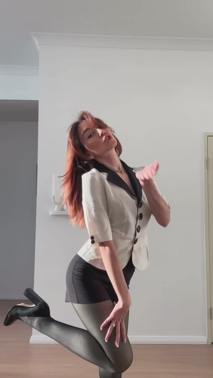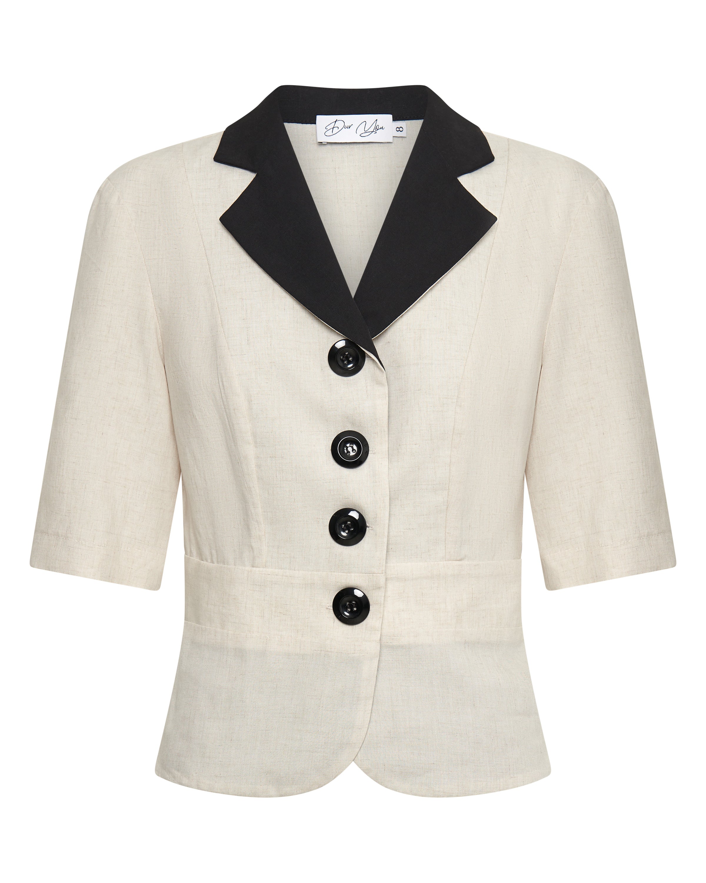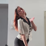 The set features a chic jacket with V-neckline on the jacket to complement all bust sizes. and 3/4 sleeves on the jacket for added arm coverage and easy front button opening on the jacket for effortless wear. The stylish shorts are slightly flared with an invisible back zipper for a streamlined look.