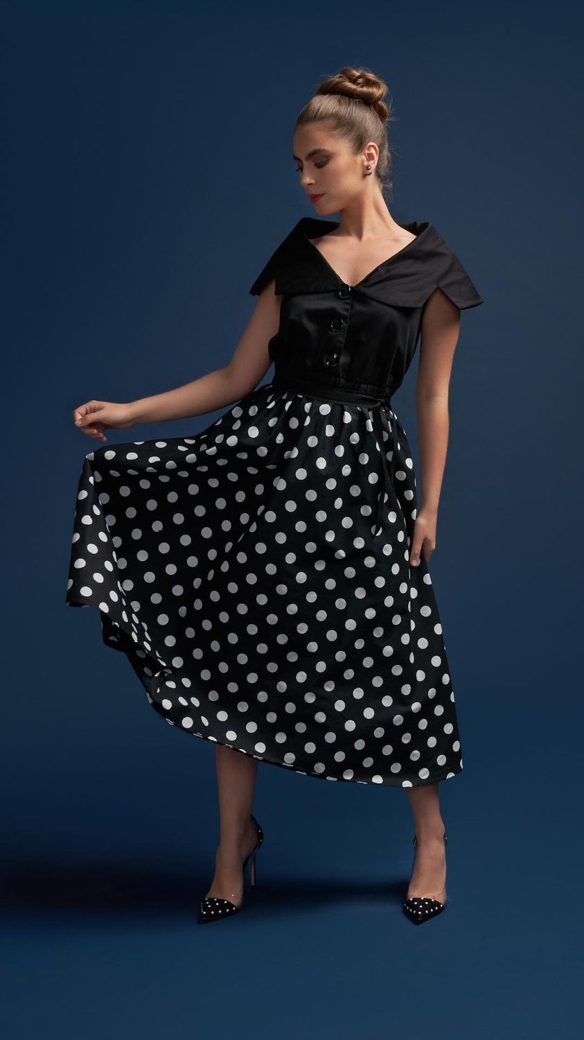 Tatiana Twirling dress with Cape Collar and Full skirt in Black & White Polka Dot