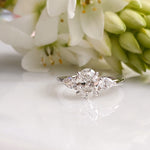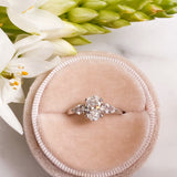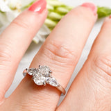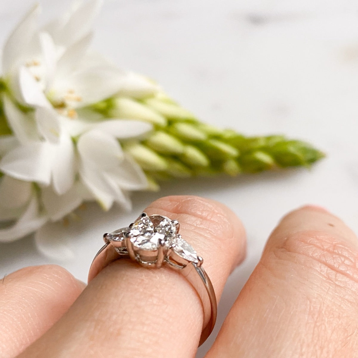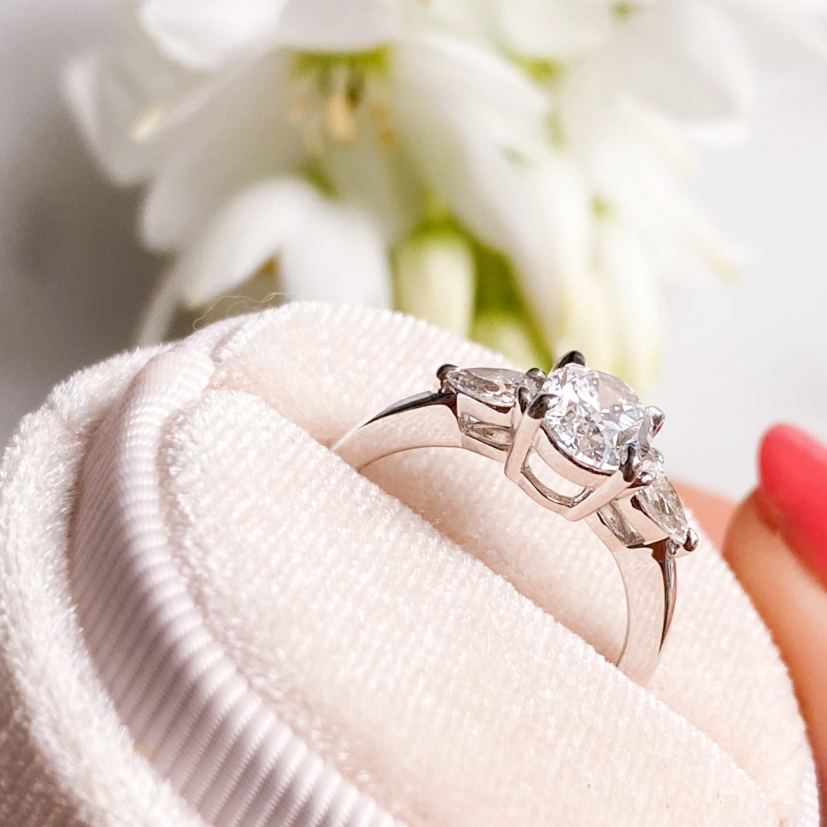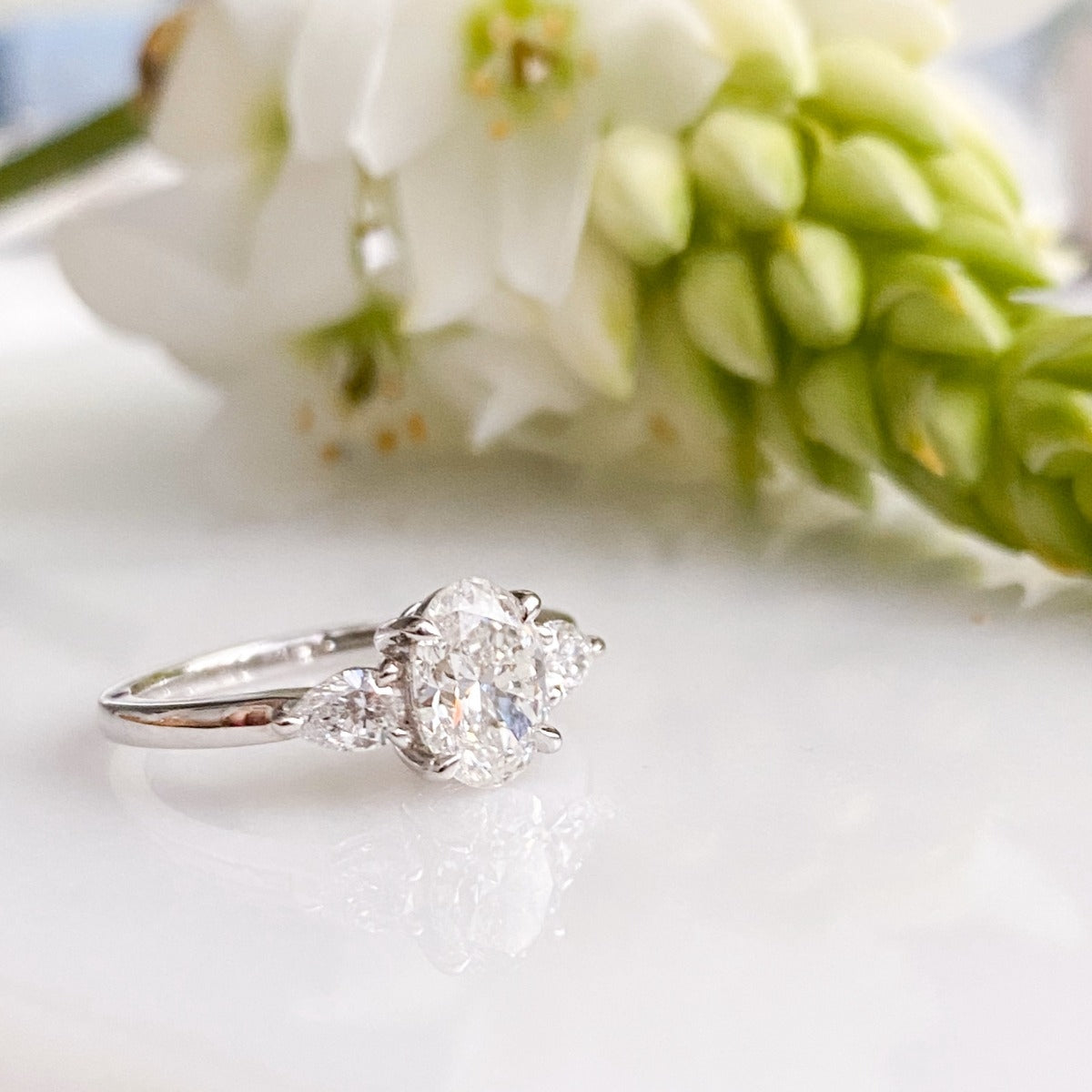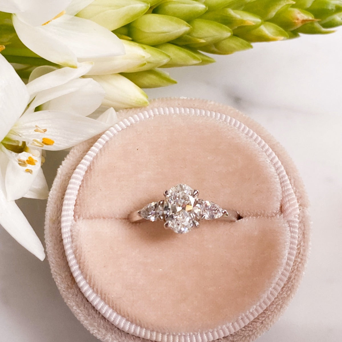 The Zoe ring is a stunning three-stone oval with pear side stones. It features a low set basket and delicate claw prongs for a modern and refined look. This is a modern version of the classic three stone design.